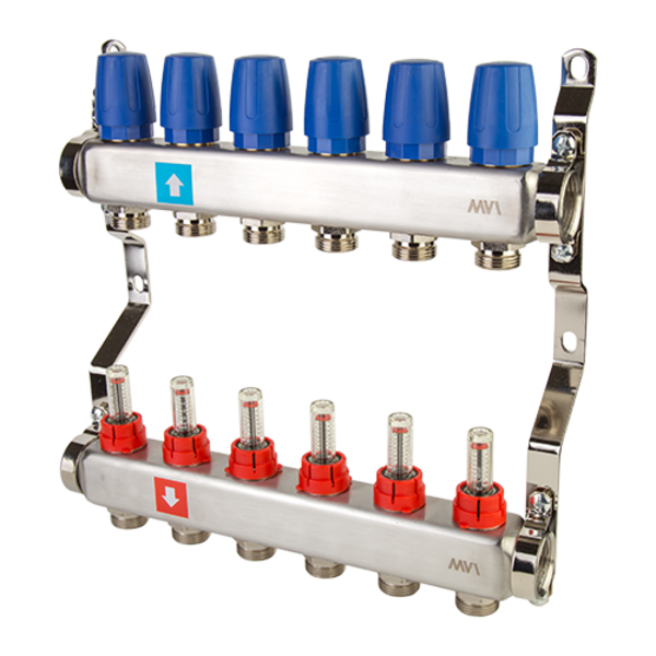 Коллектор из нержавеющей стали в сборе с расходомерами. 1" х 3/4"ЕК 6 вых. MS.506.06