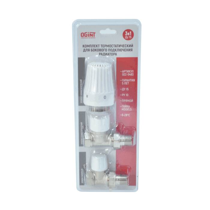Тип подключения к отопительному прибору: для бок/п радиатора; Тип: термостатический; Модель: 3в1; Чувствительный элемент: жид/нап; Тип системы отопления: для двухтр; Диаметр: Ду 15; Давление: Ру10; Конструкция: прямой; Элемент термостатический, присоединение: гайка М30х1,5; Диапазон настройки температуры: 6-28oC; Преднастройка: без преднастройки; Штуцер: штуцер без уплотнения; Бренд: Ogint;