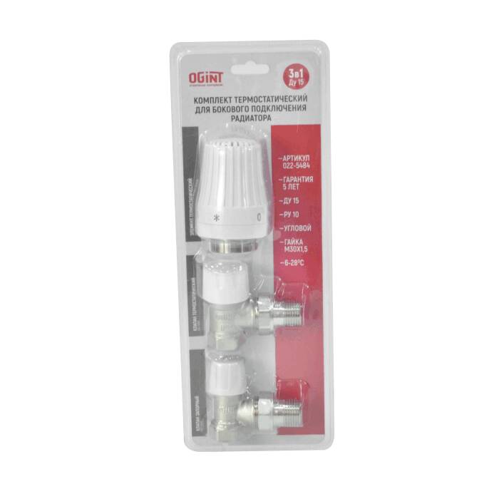 Тип подключения к отопительному прибору: для бок/п радиатора; Тип: термостатический; Модель: 3в1; Чувствительный элемент: жид/нап; Тип системы отопления: для двухтр; Диаметр: Ду 15; Давление: Ру10; Конструкция: угловой; Элемент термостатический, присоединение: гайка М30х1,5; Диапазон настройки температуры: 6-28oC; Преднастройка: без преднастройки; Штуцер: штуцер без уплотнения; Бренд: Ogint;