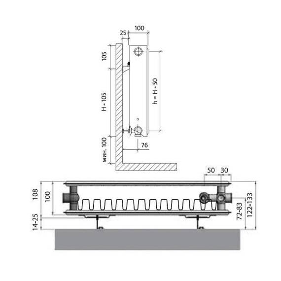 Панельный радиатор Royal Thermo VENTIL COMPACT с профилированными греющими панелями и конвекционными элементами имеет боковую панель и верхнюю декоративную решетку. Модель имеет 4 присоединительных отверстия по бокам радиатора и 2 снизу с внутренней резьбой G 1/2”.